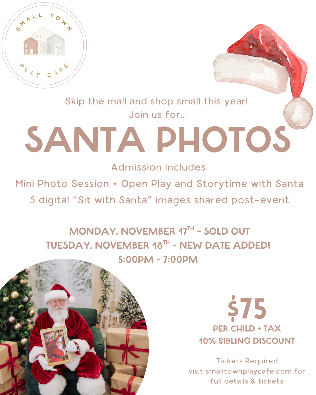 Just in time for your holiday cards! Join us for Photos with Santa, featuring open play, storytime with Santa and a Mini Photo Session with 5 digital “Sit with Santa” images shared post event.